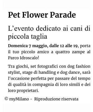 Pet Flower Parade, il primo evento dedicato ai cani di piccoli taglia che si è tenuto domenica 7 maggio 2023. Un appuntamento non solo per coloro che hanno in famiglia un amico a quattro zampe, ma anche per tutti gli amanti degli animali. La festa si è svolta dalle ore 12 alle 19, nel verde dell’Idroscalo (ingresso Bosco Sud Idroscalo Milano) con momenti glamour, fashion, cultura cinofila, food e tanto divertimento. Un appuntamento inedito e speciale, un momento di svago in tutta sicurezza per i piccoli animali e i loro padroni.